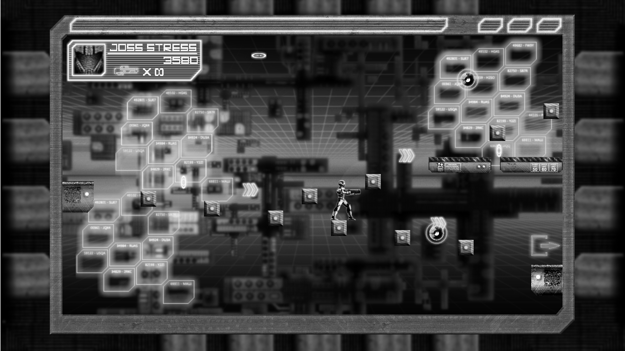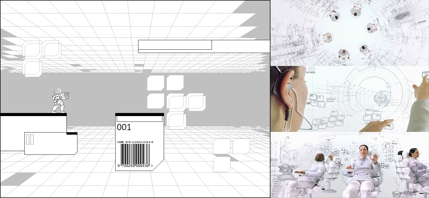 Before the arrival of the graphic designer profile, we have already decided and closed the visual style of the game, a pixel-art style with clean aesthetics, using plain colors (black & white palette for the non-passed levels, and basic color palette for cleared levels). The original art was created by me, based on previous works for TLSA Project and used in White & World project, and strongly inspired on the Zion Room Control scene from Matrix Reloaded (2003) film.