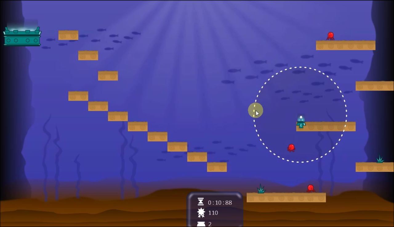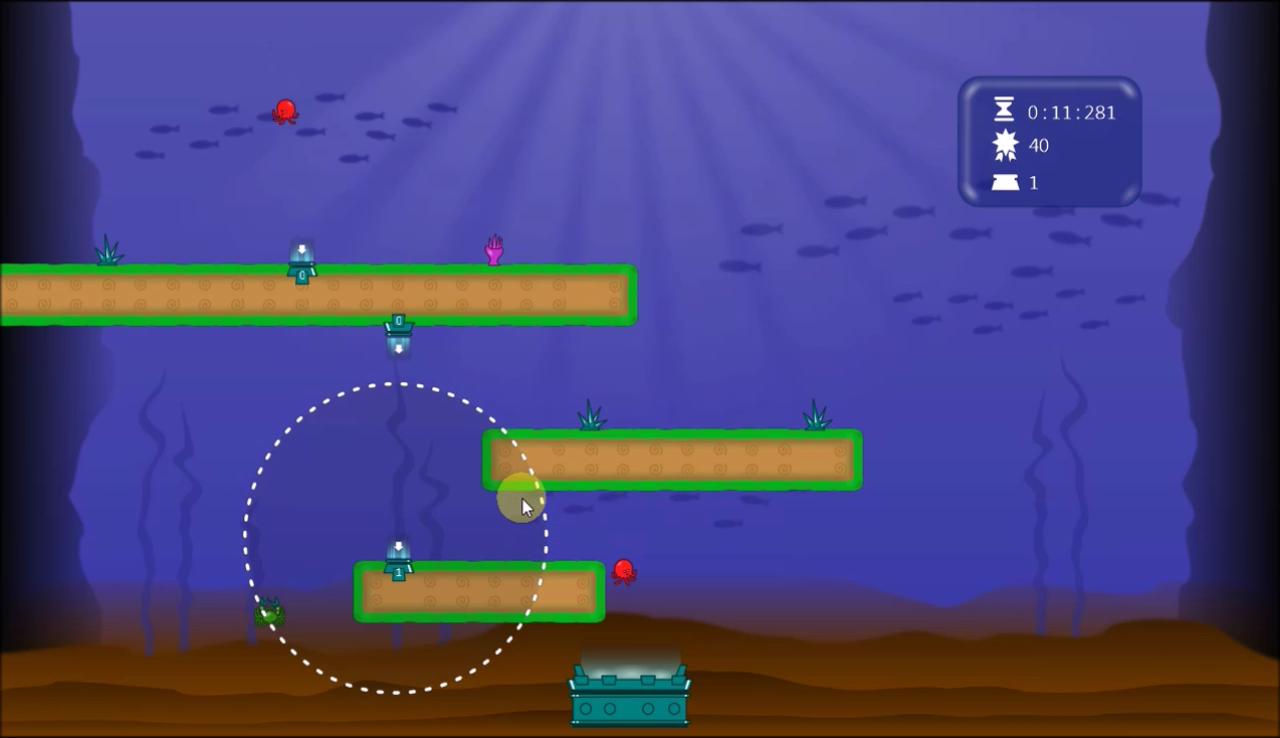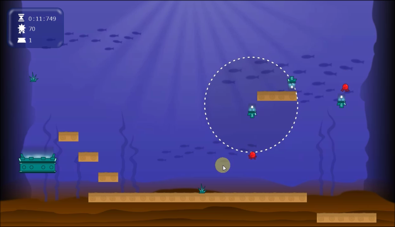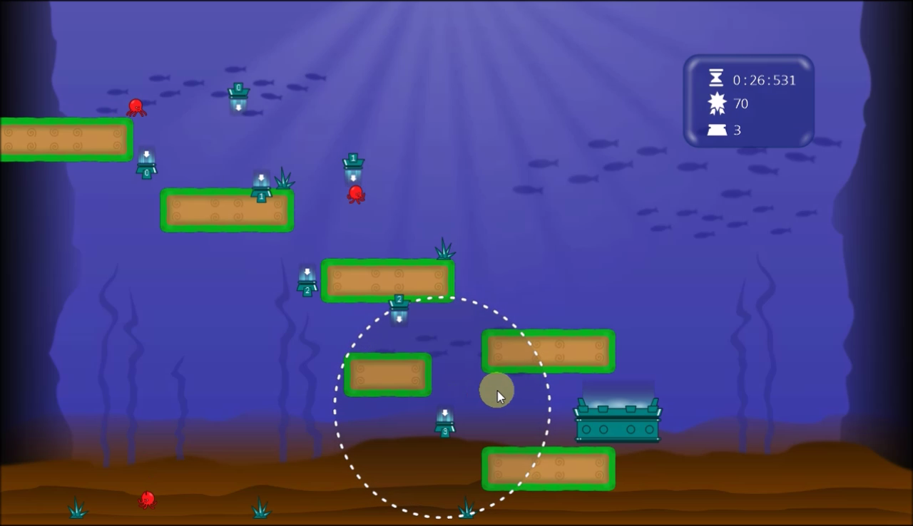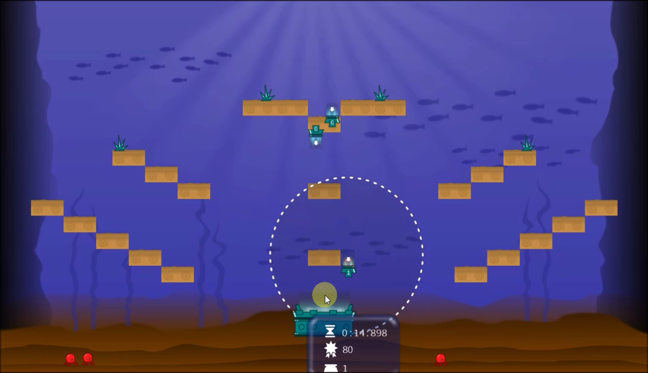 The goal is drive a group of random octopuses to a “hot pot” while preventing them to commit suicide jumping of high platforms (yes, underwater 😛) or touching some enemies. You count with a limited amount of couple-teleporters (enter and exit devices) to place in the scene, in a limited range from the enter point, using them to trying to make a strategy to drive the octupuses through determinated points.