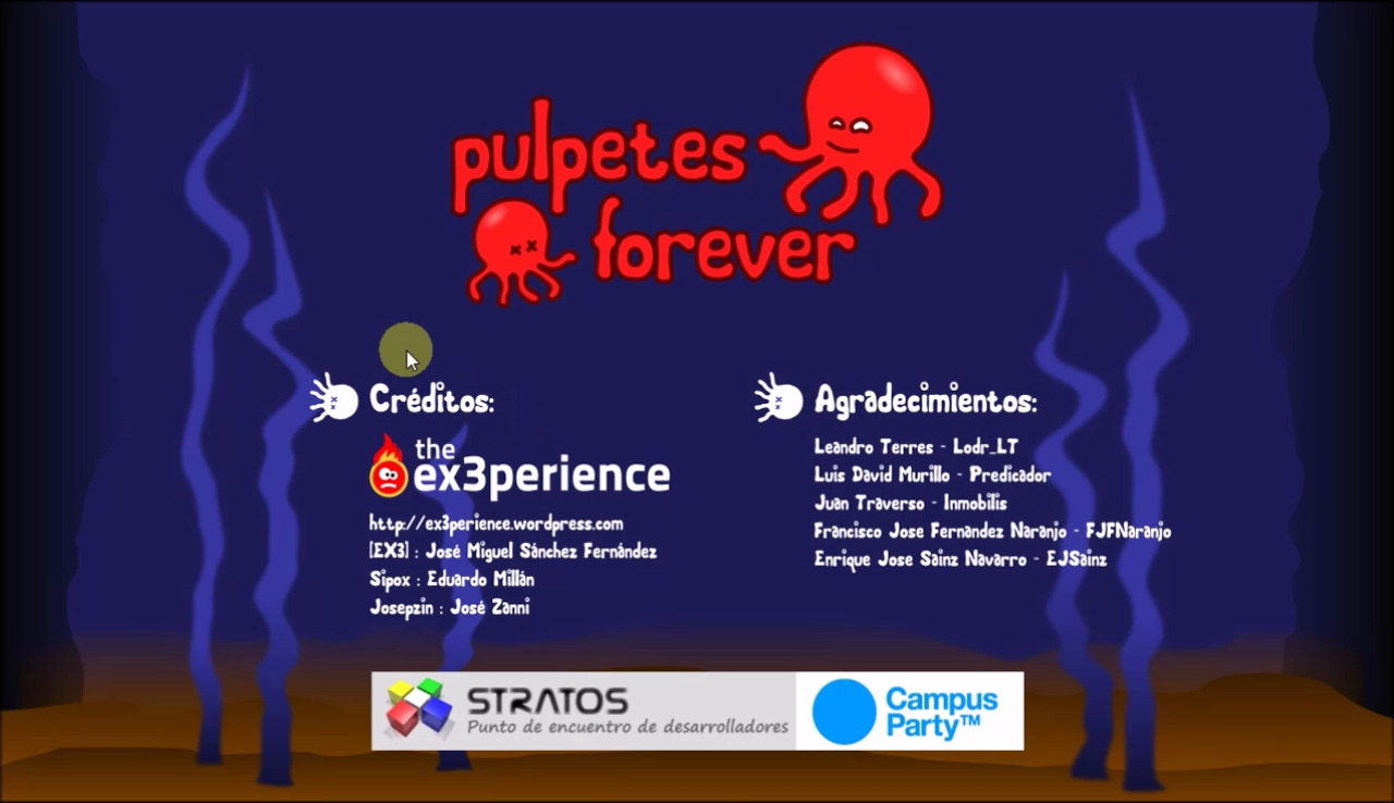 A project for the 72h gamejam in GameDev/DesarrolladorES area of Campus Party Valencia 2011 and my fifth and last Lan Party that I assisted with my coleagues from Stratos-AD. A game inspired in the classic Lemmings. The restrictions of the gamejam was: octopus, teleports and randomness.