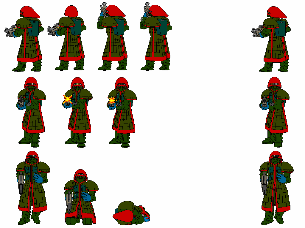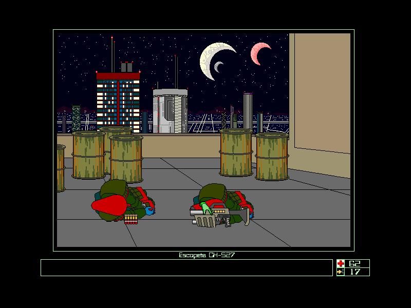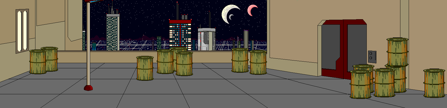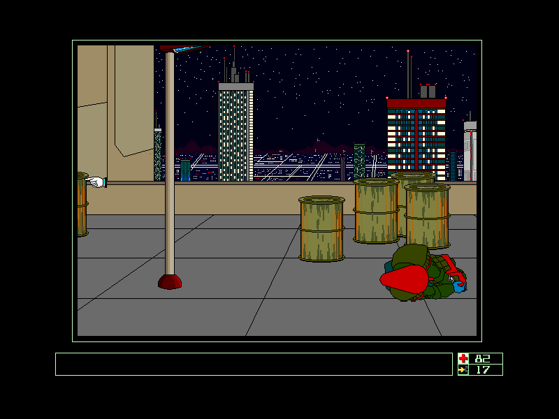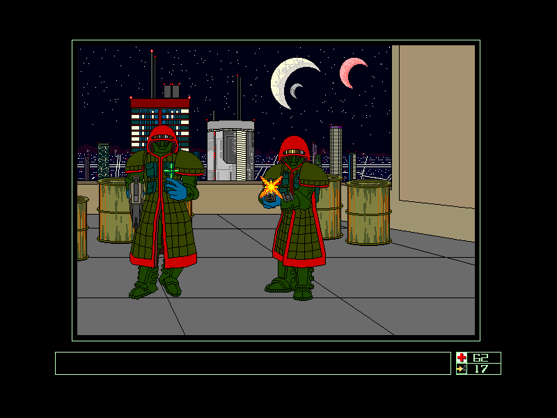 The prototype shows a scene placed on the roof of a futuristic building on an unknown planet. The player is currently under arrest by two imperial soldiers. One of them is aiming you with his shootgun. After a short dialogue with him the soldier starts to shoot you. You can shoot the soldiers with your pistol and kill them, after that you can scroll the view to search items, like a health pack to recover life.
